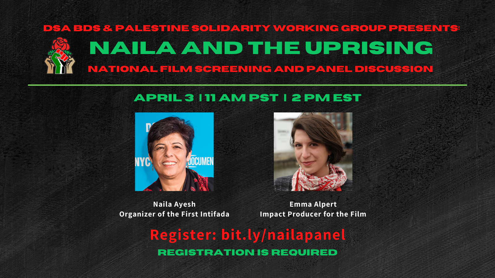 It’s an especially exciting opportunity as the panel discussion will include the Palestinian activist who helped organize the first Intifada and the film’s namesake, Naila Ayesh, along with the film’s impact producer, Emma Alpert.