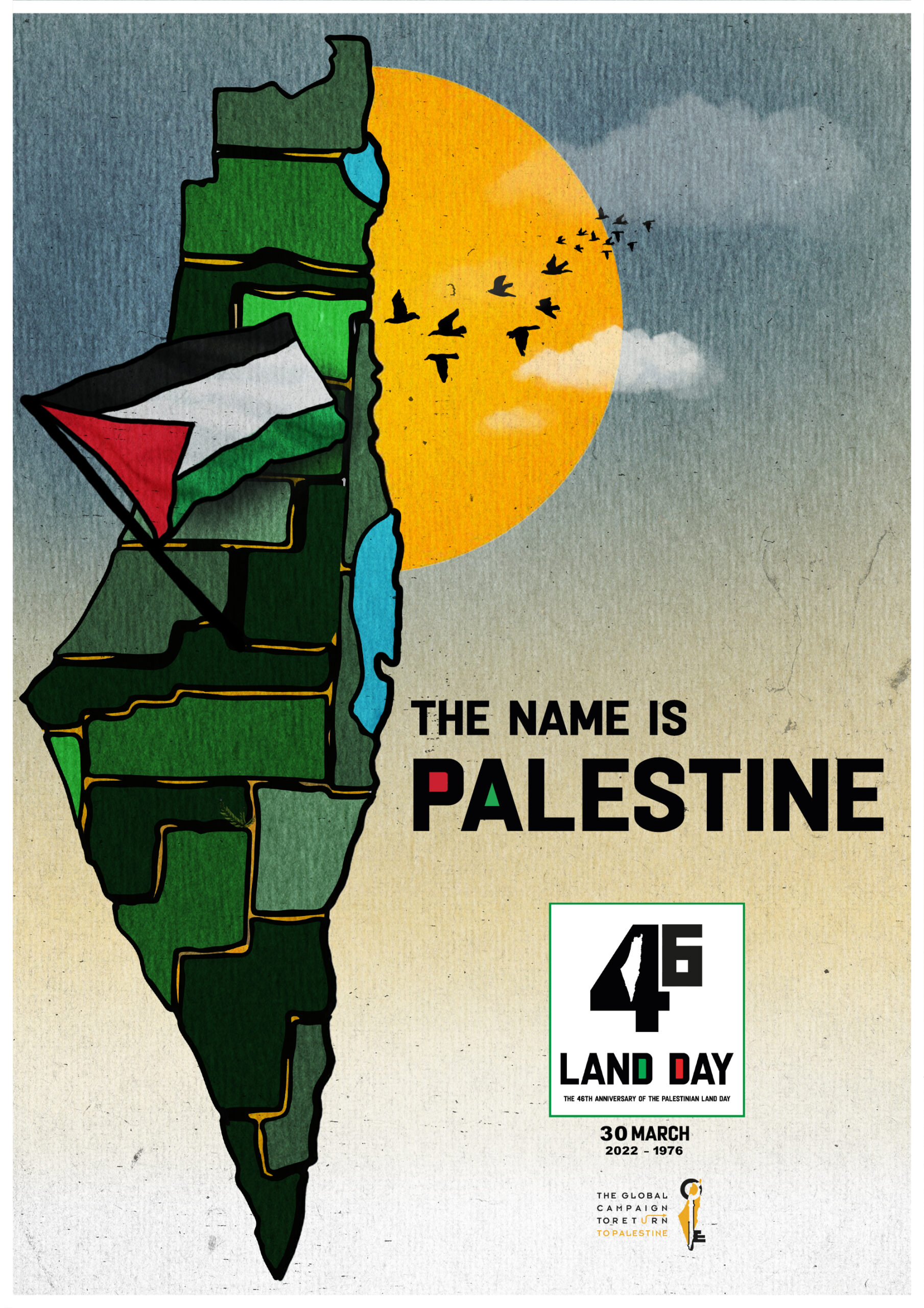 Poster produced on the occasion of the 46th anniversary of Land Day, by the Global Campaign for the Return to Palestine