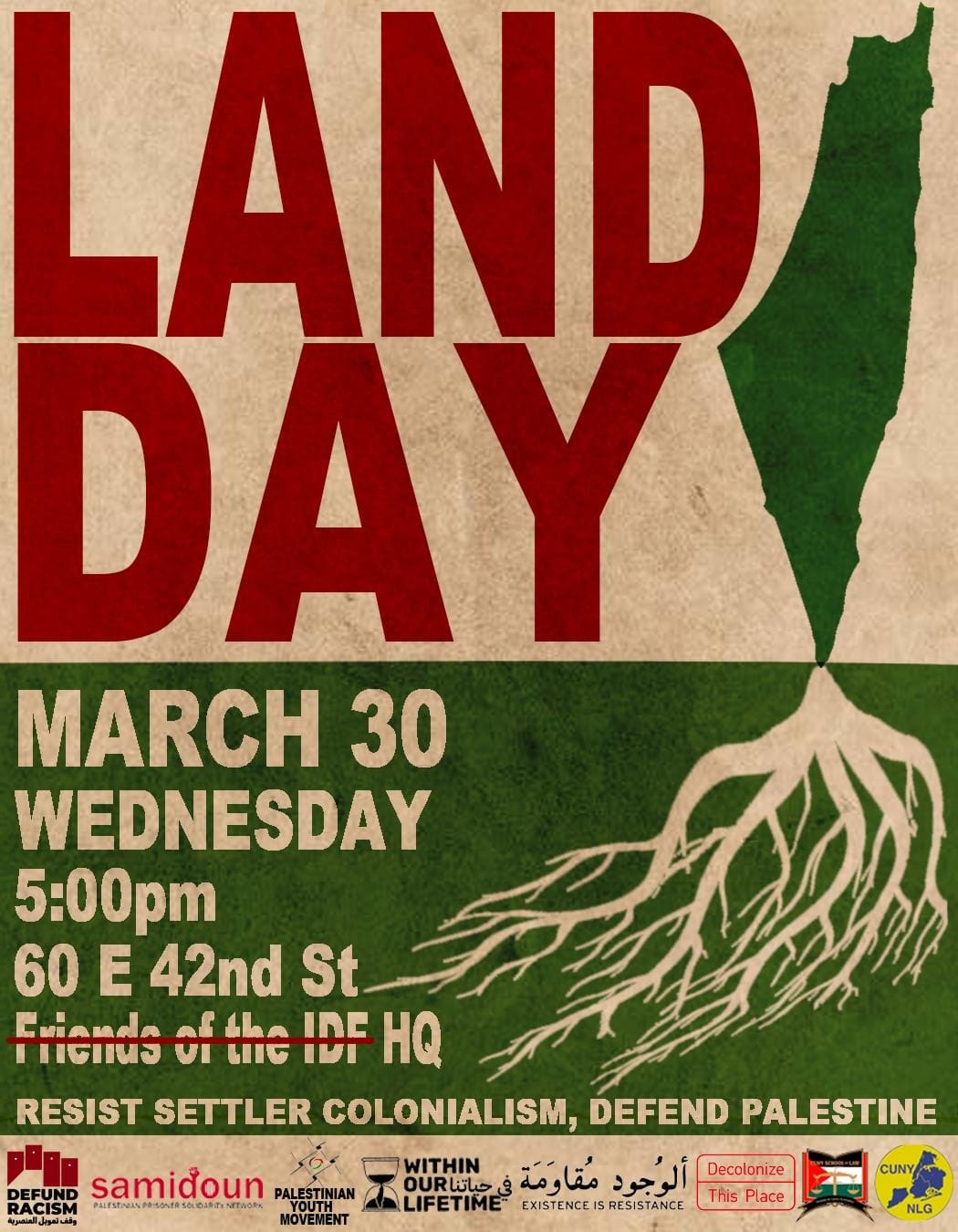 On Wednesday, 30 March — the Palestinian Day of the Land — Samidoun NY/NJ will join Within Our Lifetime – United for Palestine, the Palestinian Youth Movement, Decolonize this Place, CUNY Law Students for Justice in Palestine, Existence is Resistance, the Defund Racism campaign and other organizers to rally outside the headquarters of the “Friends of the IDF” at 5 pm. All supporters of justice in Palestine are invited to join in the New York action.