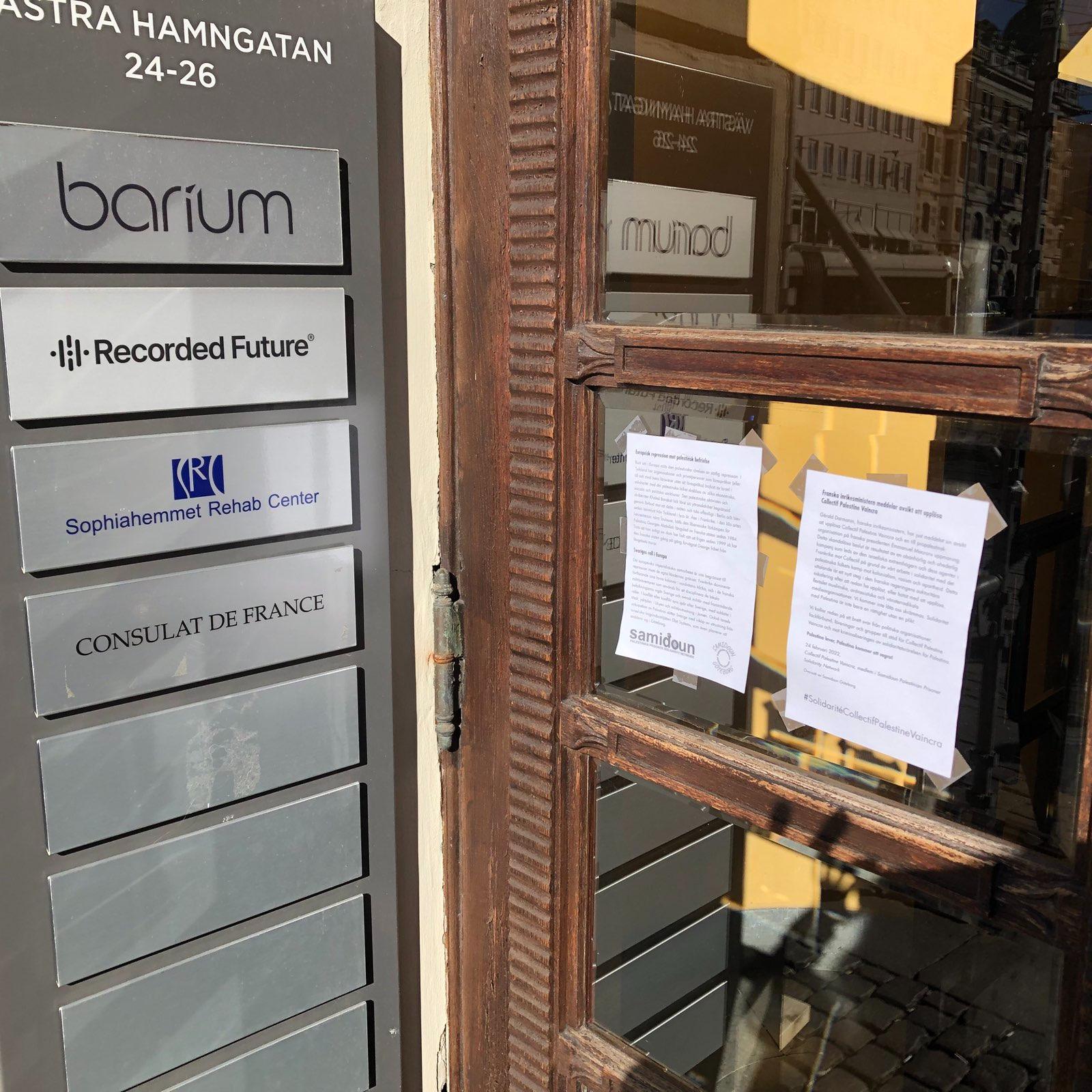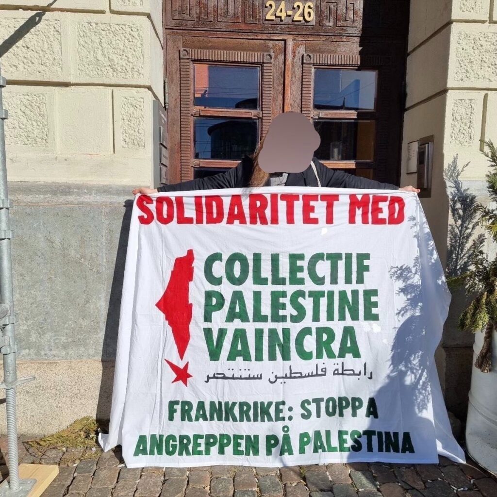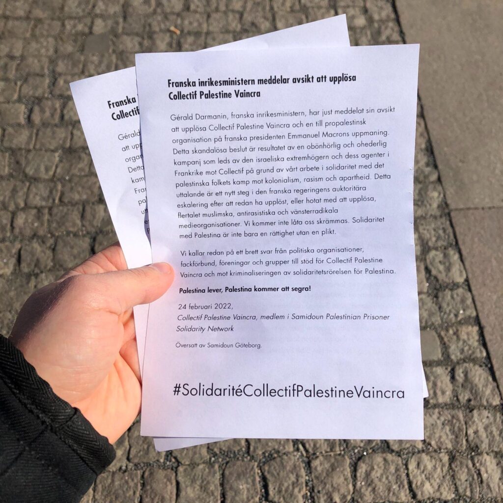 Meanwhile, in Gothenburg, Sweden, comrades from Samidoun Gothenburg distributed leaflets and taped a letter to the door of the French consulate in solidarity with the Collectif Palestine Vaincra, demanding that their ban on the organizations be immediately rescinded.