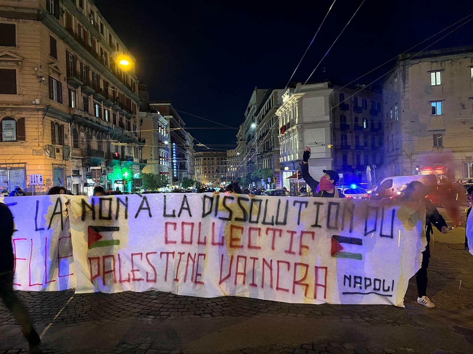 On March 8 in Naples, Italy, demonstrators joined the International Women’s Day march with a banner against the dissolution of Collectif Palestine Vaincra.