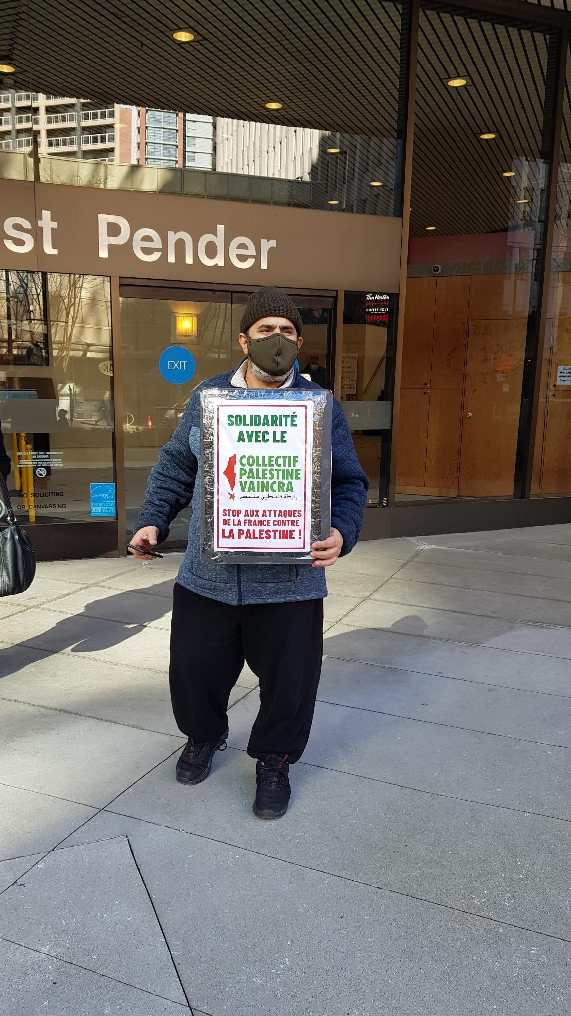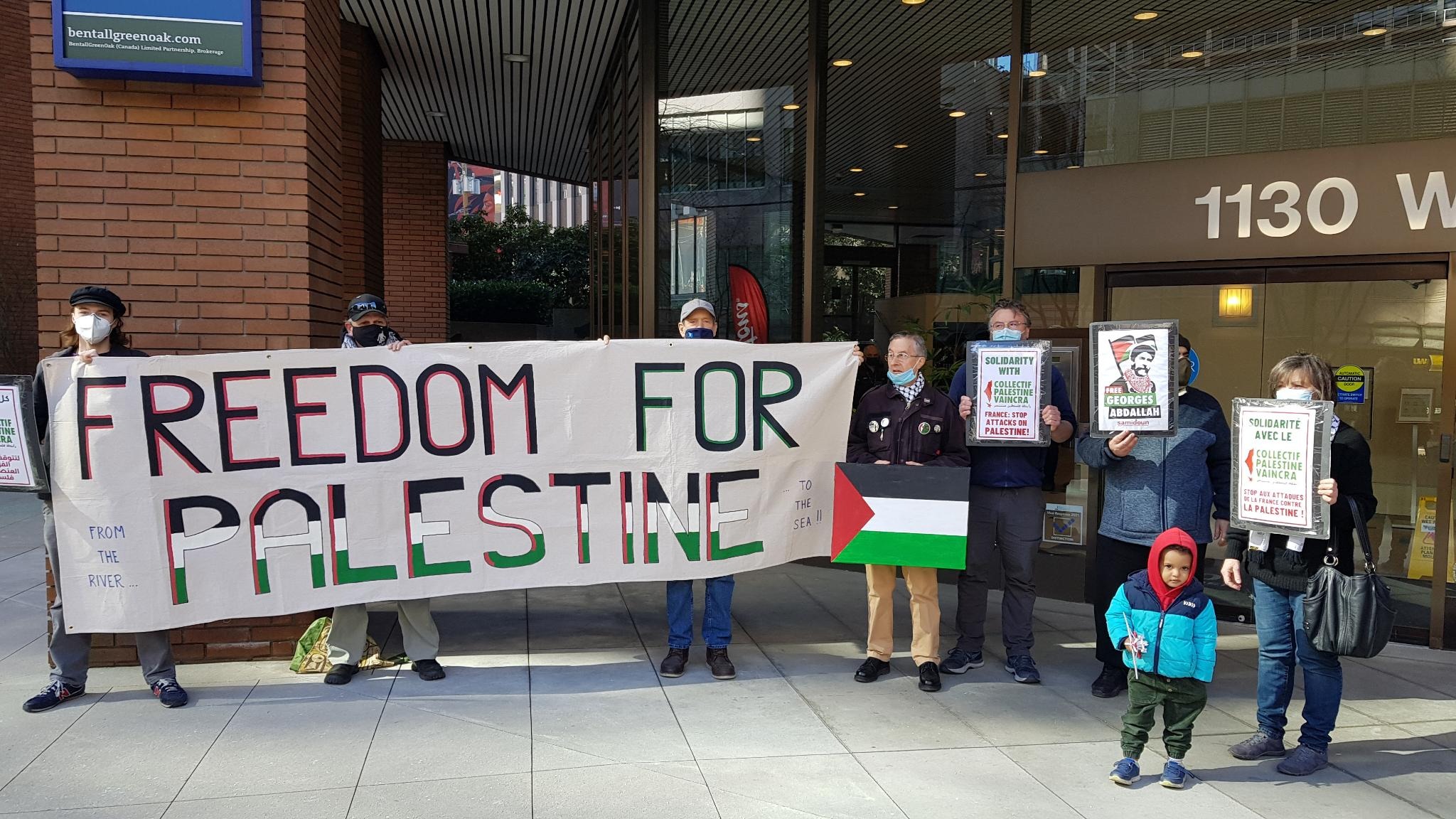 In Vancouver, Canada, activists from Samidoun Vancouver, Canada Palestine Association, BDS Vancouver – Coast Salish and the International League of Peoples’ Struggle delivered a strong letter of protest to the French consulate on Wednesday, 9 March. They hand-delivered the letter to the Vice-Consul despite police interference, carrying banners and signs of solidarity with the Collectif Palestine Vaincra and targeted organizations. They also delivered a letter to the German consulate in solidarity with Palestinian writer Khaled Barakat, currently appealing a political ban imposed upon him by German immigration officials.