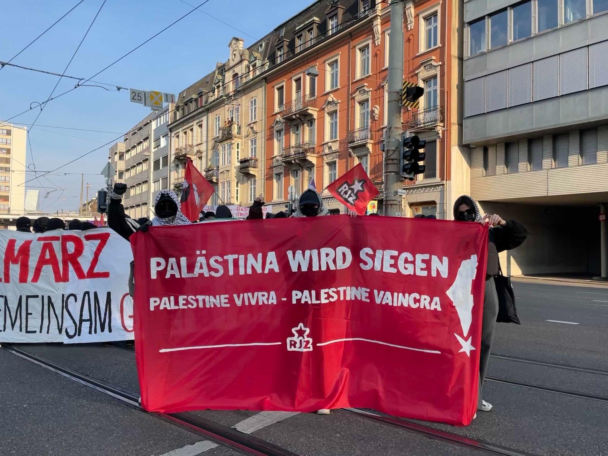 At the 11 March demo marking International Working Women’s Day in Zurich and at the 12 March demo in Bâle against war in Ukraine, marchers denounced the dissolution and supported the Palestinian liberation struggle.