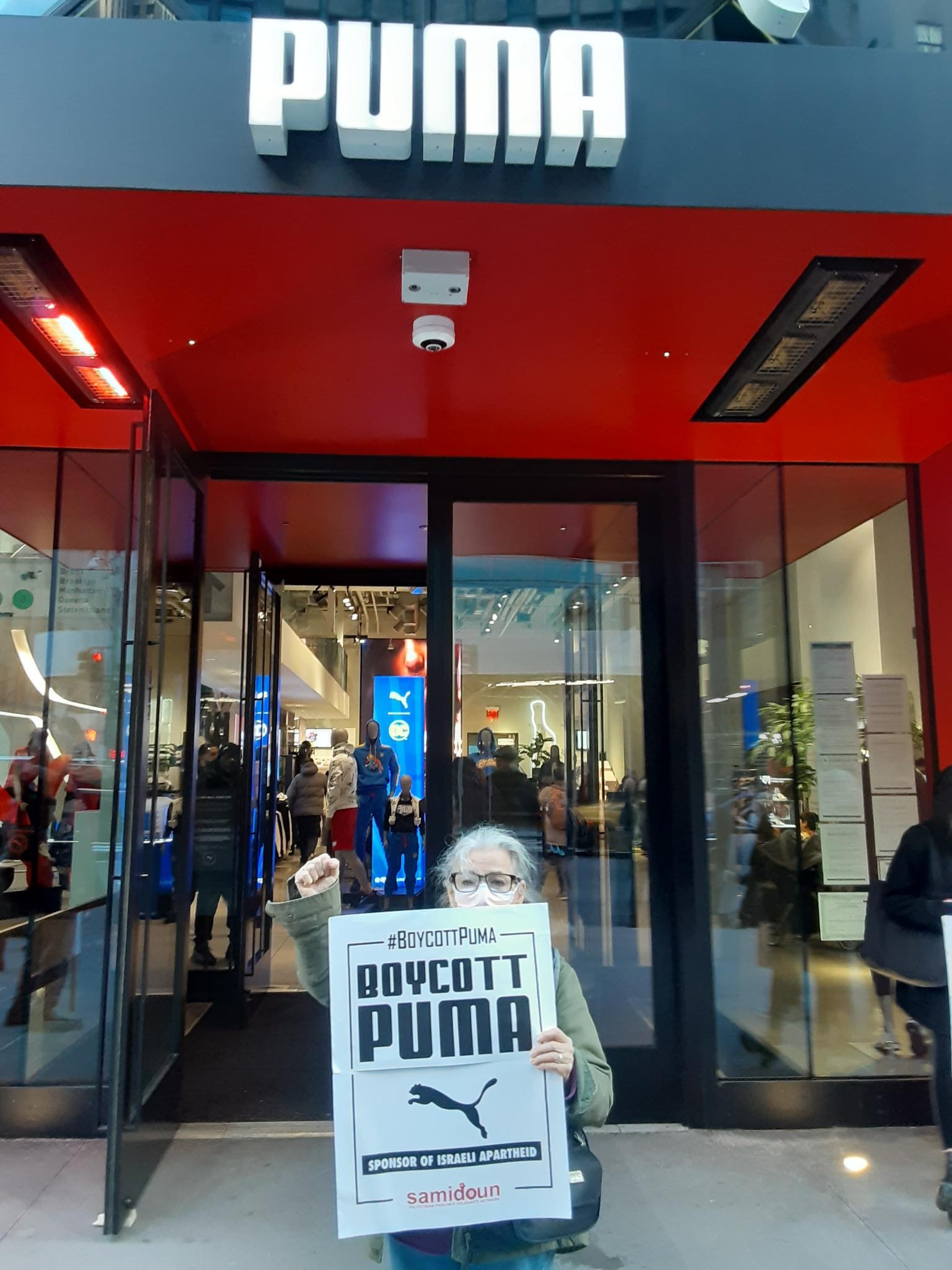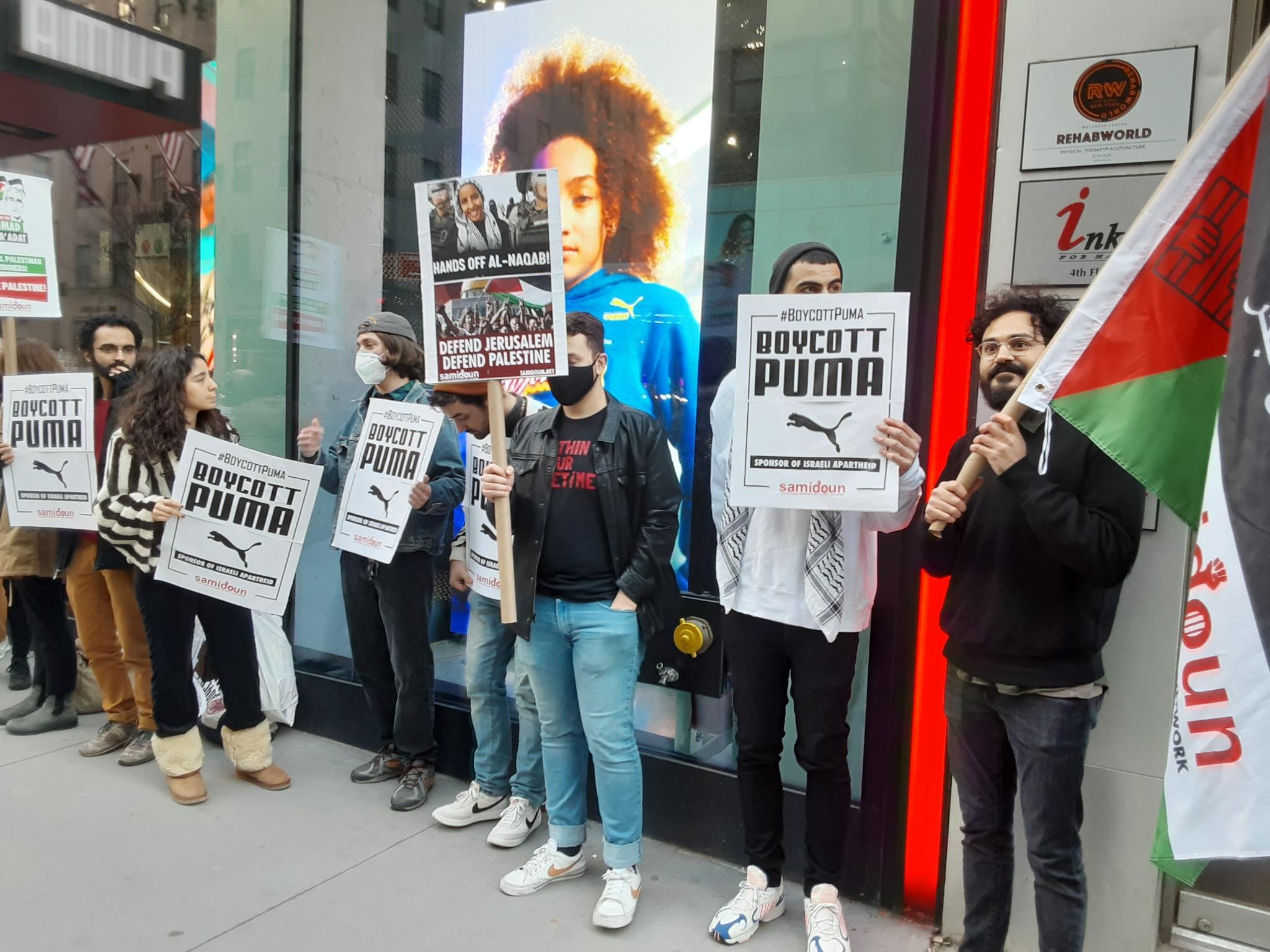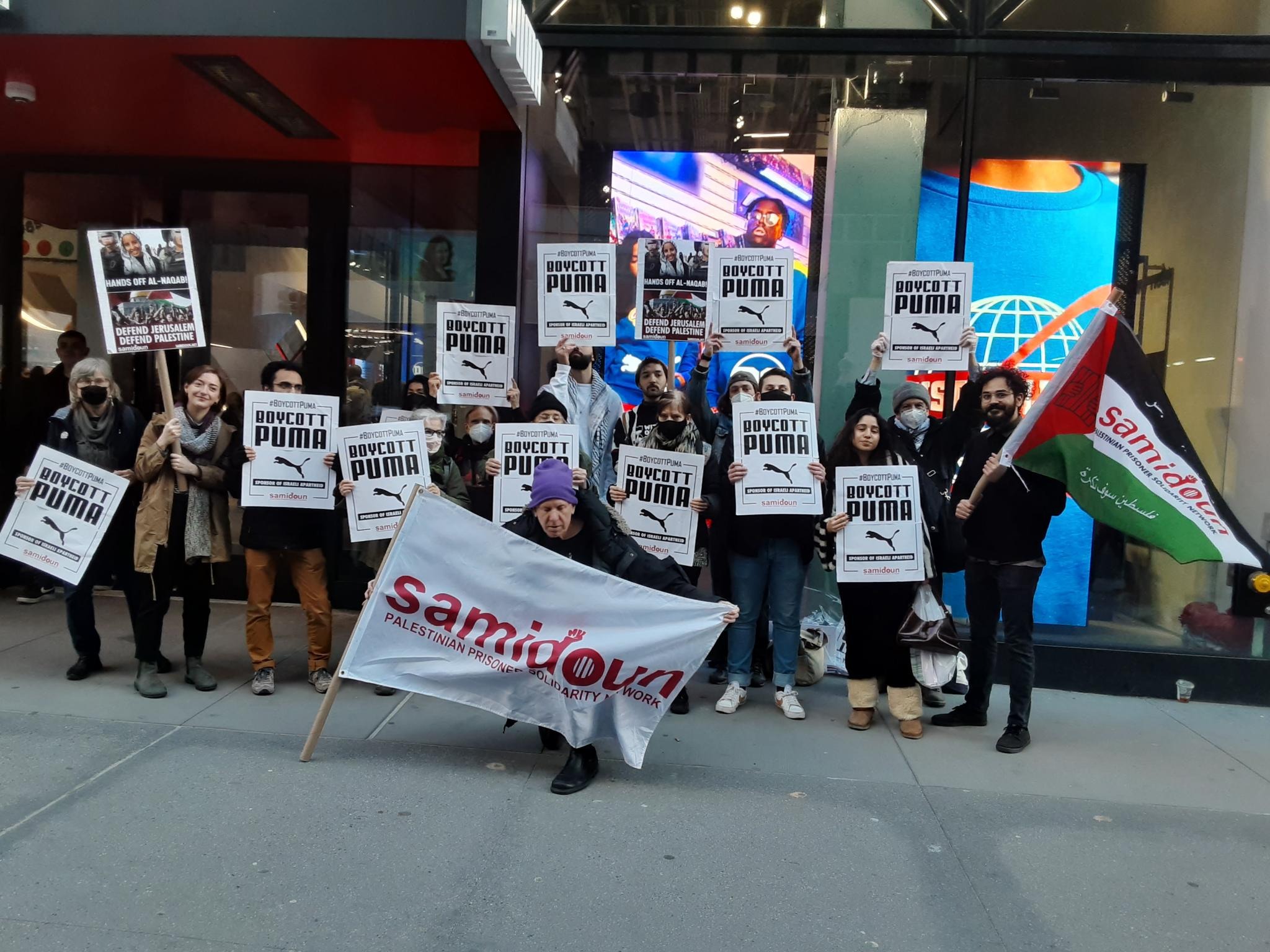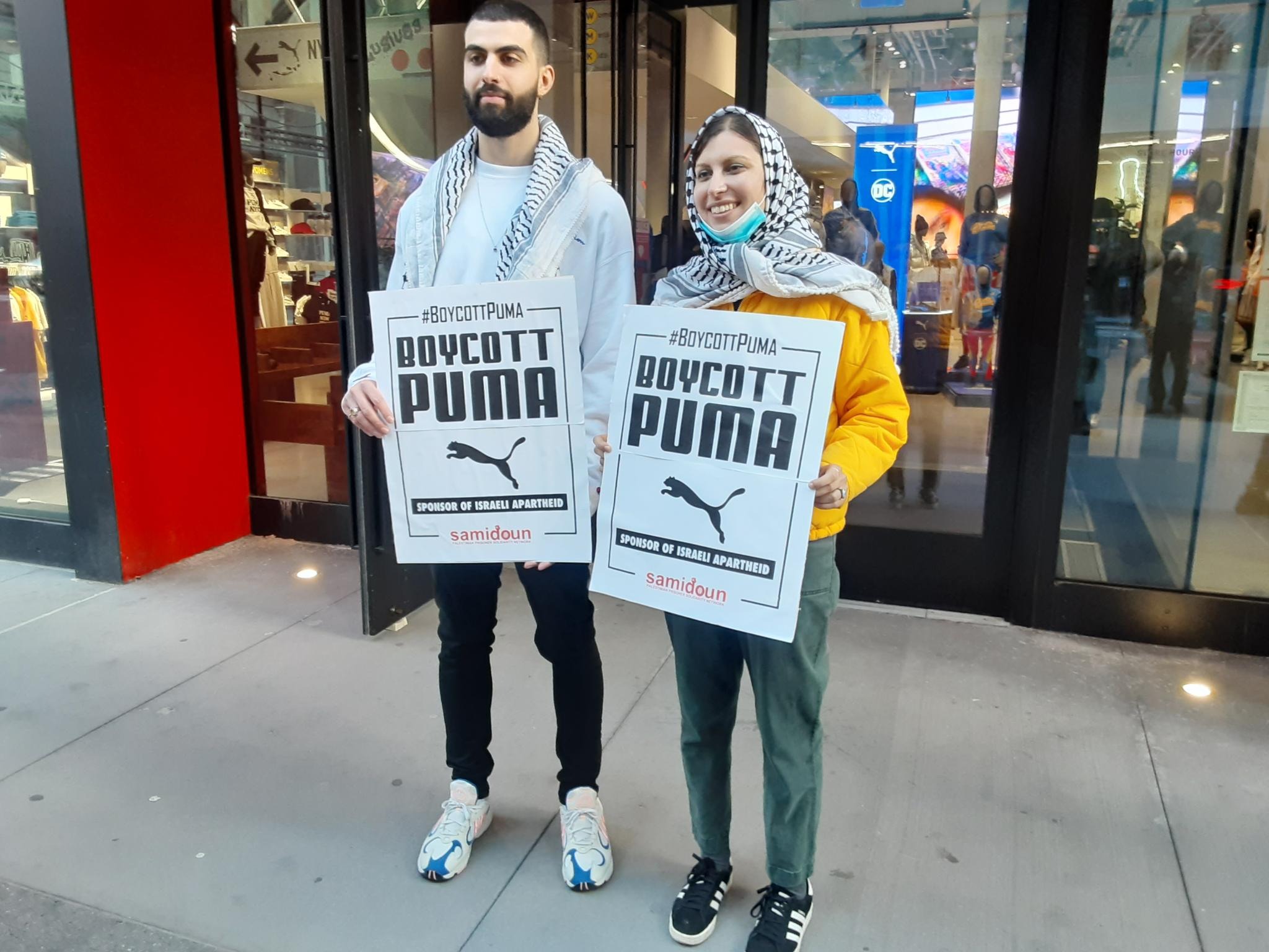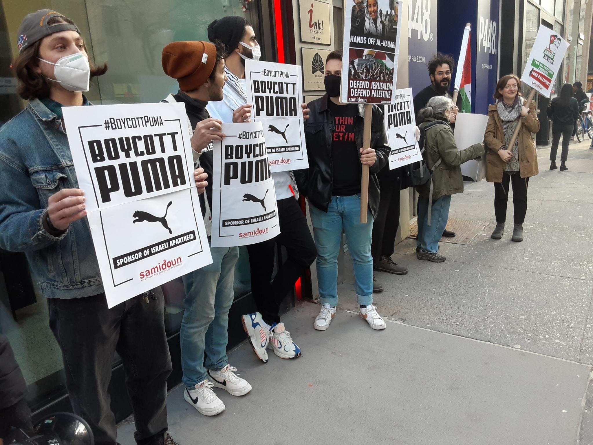 Participants in the demonstration chanted loudly outside PUMA’s flagship store in Manhattan, denouncing the company’s complicity in Zionist crimes. Laila of Samidoun chanted “Long live Palestine, Free, free Palestine;” “Puma, Puma, you will see, Palestine will be free! Puma, Puma, you will learn, refugees will return!” outside the large store.