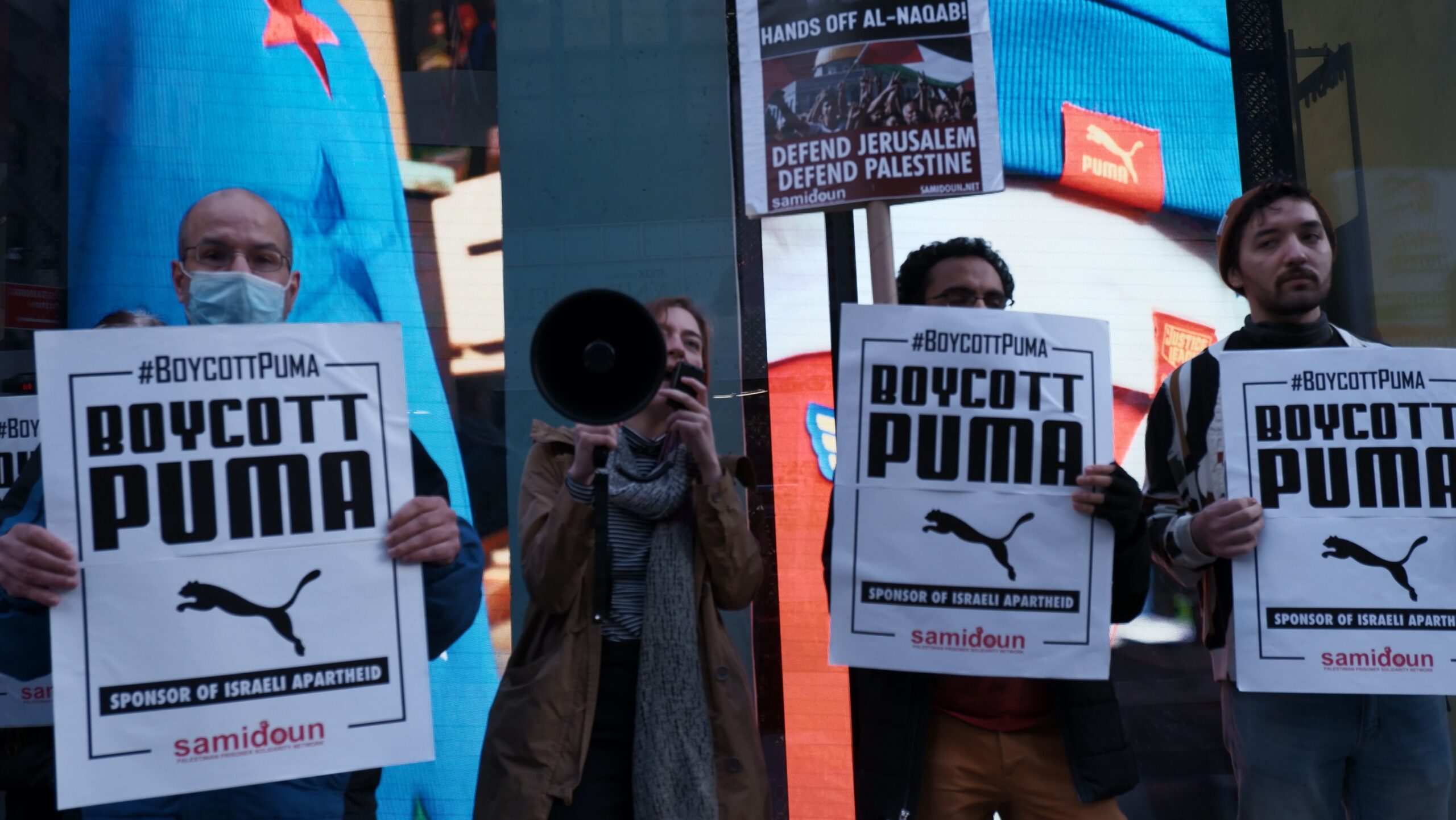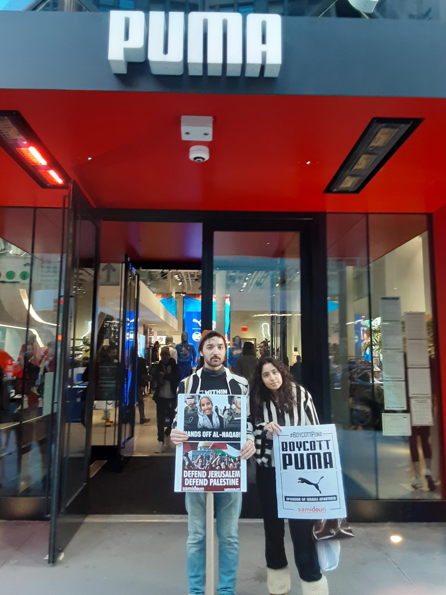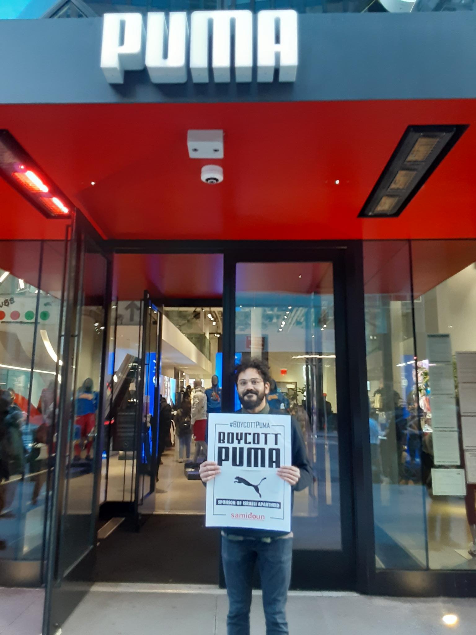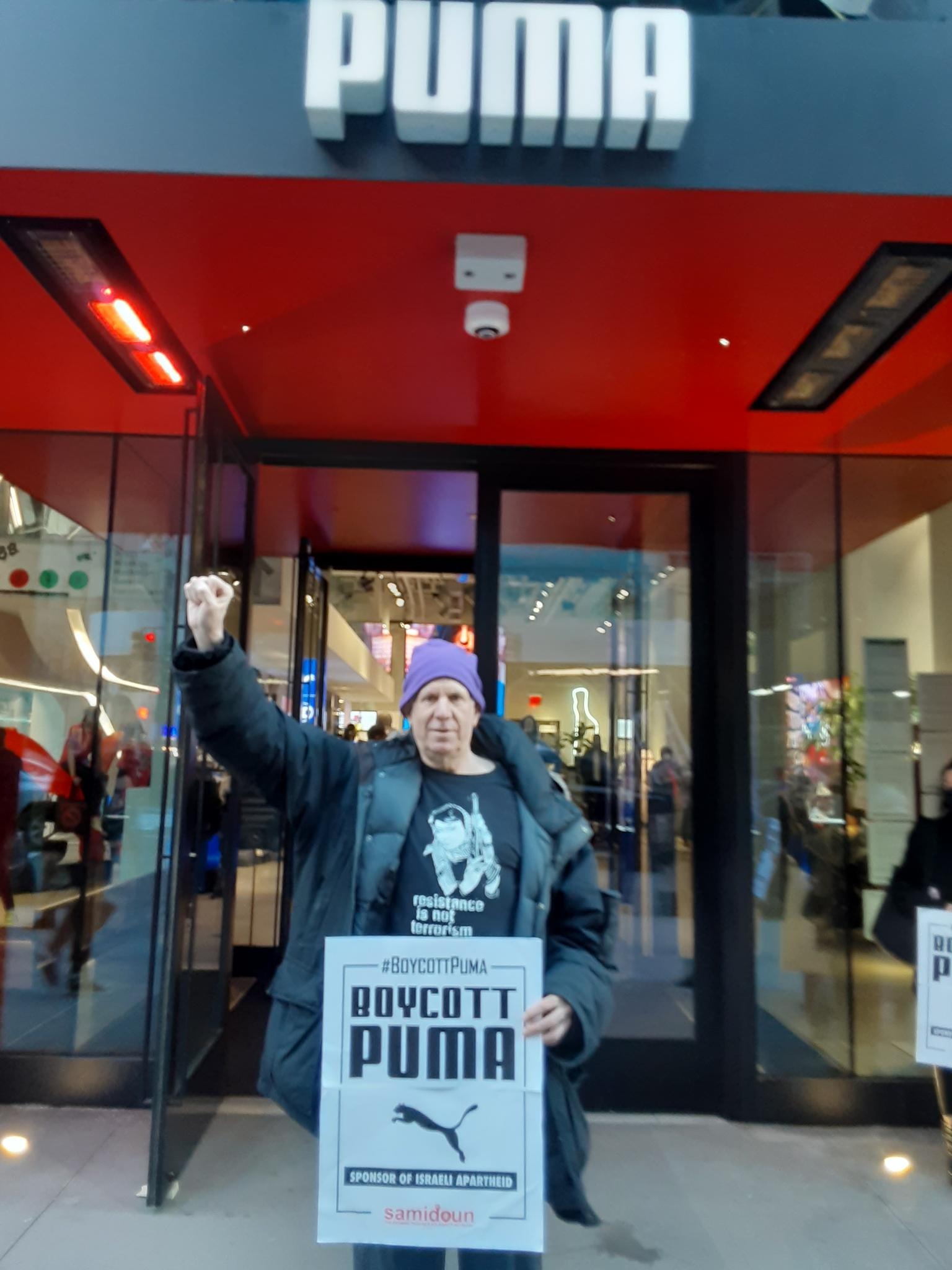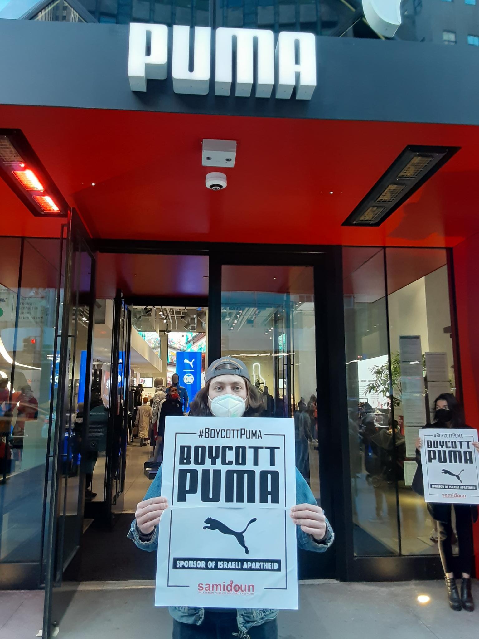 Participants in the demonstration chanted loudly outside PUMA’s flagship store in Manhattan, denouncing the company’s complicity in Zionist crimes. Laila of Samidoun chanted “Long live Palestine, Free, free Palestine;” “Puma, Puma, you will see, Palestine will be free! Puma, Puma, you will learn, refugees will return!” outside the large store.