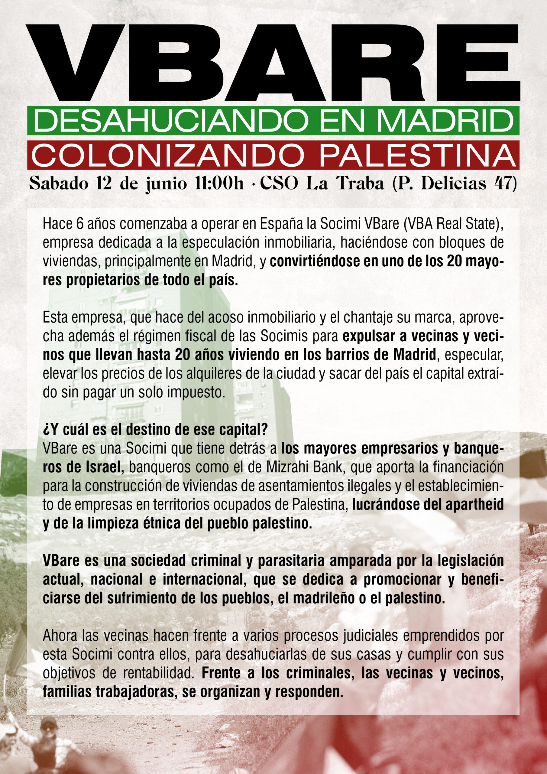 * Este artigo foi escrito com base nos relatórios de contas públicas do Socimi VBare, o colóquio realizado entre ativistas pelo povo palestino e ativistas pelo direito à moradia em Madrid no Centro Social Ocupado “La Traba” e o trabalho conjunto de várias organizações de ambas as áreas que iniciam a partir de hoje a campanha de boicote à VBare.