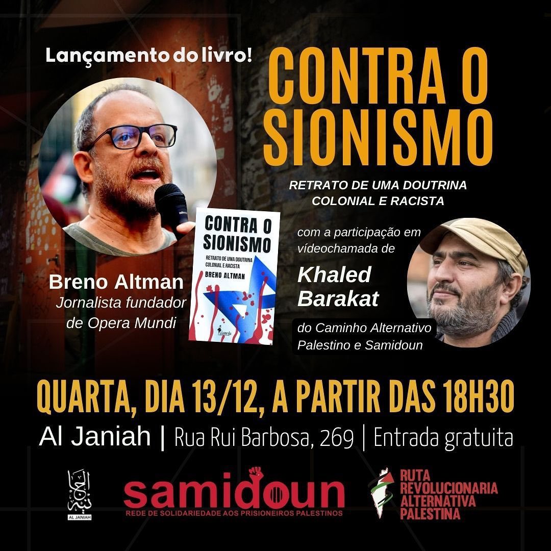 O Al Janiah tem a honra de receber o lançamento do livro “Contra o Sionismo: retrato de uma doutrina colonial e racista” (Alameda), de Breno Altman, na quarta-feira (13), a partir das 18h30.