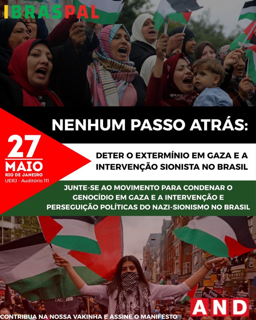 Em parceria com o jornal A Nova Democracia (AND), o Instituto Brasil-Palestina (Ibraspal) convoca um ato político nacional para condenar o genocídio em Gaza e a intervenção e perseguição políticas do nazi-sionismo no Brasil, dia 27 de maio de 2025, no Rio de Janeiro.